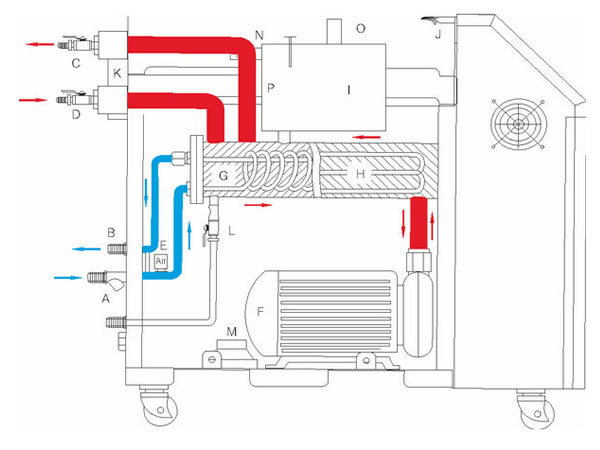 、冷却水入口 、至模具 、电磁阀 、冷却桶 1、副油箱 、液位镜 、 、注油口